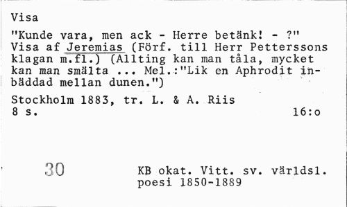 //// Visa //// "Kunde vara, men ack - Herre betänk! - ?" Visa af Jeremias (Förf. till Herr Petterssons klagan m.fl.) (Allting kan man tåla, mycket kan man smälta ... Mel.:"Lik en Aphrodit inbäddad mellan dunen.") //// Stockholm 1883, tr. L. & A. Riis 8 s. 16:o //// 30 KB okat. Vitt. sv. världsl. //// poesi 1850-1889 ////