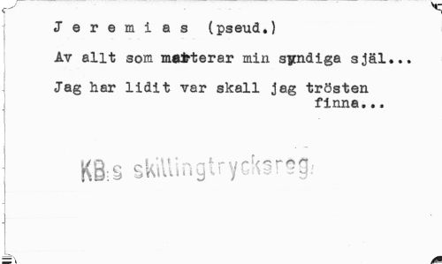 //// Jeremias (pseud.) //// Av allt som mairterar min syndiga själ... //// Jag har lidit var skall jag trösten //// finna... //// KS;8 skillingtrycksreg; _ » ////