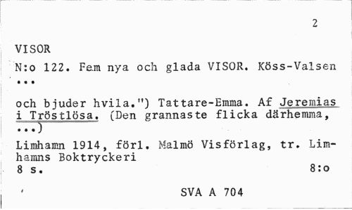 //// 2 //// VISOR //// N:o 122. Fe.m nya och glada VISOR. Köss-Valsen • • • //// och bjuder hvila.") Tattare-Emma. Af Jeremias i Tröstlösa. (Den grannaste flicka därhemma, ..«) //// Limhamn 1914, förl, Malmö Visförlag, tr. Limhamns Boktryckeri //// 8 s. 8:o //// SVA A 704 ////