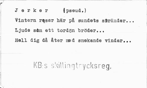//// Jerker (pseud.) //// Vintern rasar här på sundets stränder... //// Ljude stal ett tordön "bröder... //// Hell dig då åter ned smekande vindar... //// KB:s skiUinqtrycksreg, ////