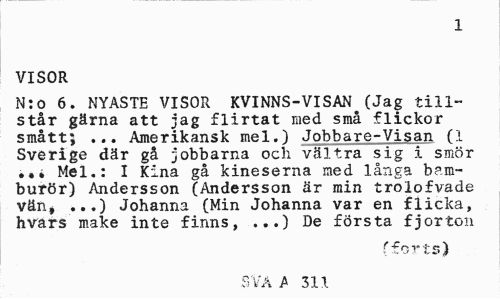 //// 1 //// VISOR //// N:o 6. NYASTE VISOR KVINNS-VISAN (Jag tillstår gärna att jag flirtat med små flickor smått; ... Amerikansk mel.) Jobbare-Visan (1 Sverige där gå jobbarna och vältra sig i smör ••» Mel.: I Kina gå kineserna med långa bamburör) Andersson (Andersson är min trolofvade vän# ...) Johanna (Min Johanna var en flicka, hvars make inte finns, ...) De första fjorton //// fforts) //// SVA A 311 ////
