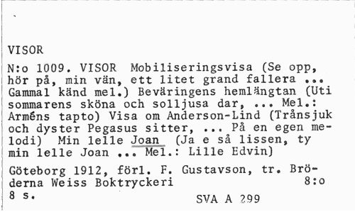 //// VISOR //// N:o 1009. VISOR Mobiliseringsvisa (Se opp, hör på, min vän, ett litet grand fallera ... Gammal känd mel.) Beväringens hemlängtan (Uti sommarens sköna och solljusa dar, ... Mel.: Arméns tapto) Visa om Anderson-Lind (Trånsjuk och dyster Pegasus sitter, ... På en egen melodi) Min lelle Joan (Ja e så lissen, ty min lelle Joan ... Mel.: Lille Edvin) //// Göteborg 1912, förl. F. Gustavson, tr. Bröderna Weiss Boktryckeri 8:0 //// 8 s* SVA A 299 ////