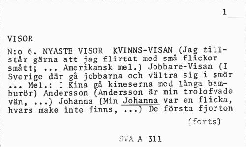 //// 1 //// VISOR //// N:o 6. NYASTE VISOR KVINNS-VISANo(Jag tillstår gärna att jag flirtat med små flickor smått; ... Amerikansk mel.) Jobbare-Visan (I Sverige där gå jobbarna och vältra sig i smör ... Mel.: I Kina gå kineserna med långa bamburör) Andersson (Andersson är min trolofvade vän, ...) Johanna (Min Johanna var en flicka, hvars make inte finns, ...) De första fjorton //// fforts) //// SVA A 311 ////