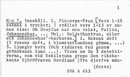 //// 1 //// N: o 7. Innehåll, 1. Pintorpa-Frun [.Vers 1-25 saknas i trycket; I stället vers 1-13 av annan visa: Om Dreyfus har man talat, Pallin, Johanneshus, ... Mel.: Soldathustrun, eller ock Johanneshus"-barbaren.l 2. Rosens doft (I rosens doft, i blomsterlundens gömma, .,.) 3. Ljungby horn (Och riddaren red genom grönskande lund ...). Visan om De 3 detektiverna, som vid Eskilstuna grepo den riksbekante Sjöröfvaren Nordlund (Tre djerfva män- //// (forts) //// SVA A 45 3 ////