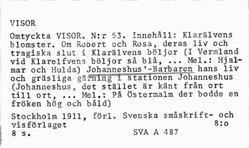 //// VISOR //// Omtyckta VISOR0 N:r 53. Innehåll: Klarälvens blomster. Om Robert och Rosa, deras liv och tragiska slut i Klarälvens böljor (I Vermland vid Klarelfvens böljor så blå, ... Mel.: Hjalmar och Hulda) Johanneshus'^Barbaren hans liv och gräsliga gäaiing i stationen Johanneshus (Johanneshus, det stället är känt från ort till ort, ... Mel.: På Östermalm der bodde en fröken hög och båld) //// Stockholm 1911, förlo Svenska småskrift- och visförlaget 8:0 //// 8 s. SVA A 487 ////