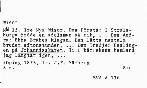 //// Wisor //// N§ 12. Tre Nya Wisor. Den Första: I Strals-burga bodde en adelsman så rik, ... Den Andra: Ebba Brahes klagan. Den lätta manteln breder aftonstunden, ... Den Tredje: Enslingen på Johannisskäret. Till kärlekens hemland jag längtar igen, 77. //// Köping 1875, tr. J.F. Säfberg 8 s. 8:o //// SVA A 116 ////