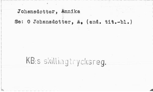 //// Johansdotter, Annika Se: 0 Jo&ansdotter, A, (end. tit.-bl.) //// I //// I //// ! KB:S sktliingtrycksreg, //// i i I i //// ^ å ////