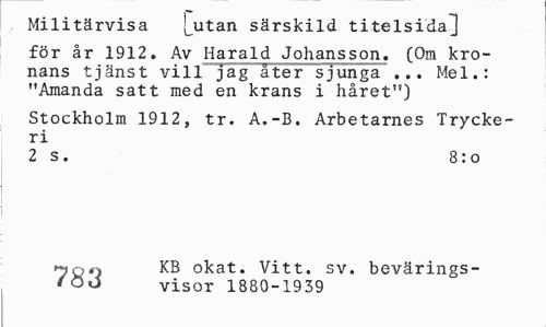//// Militärvisa [utan särskild titelsida^ //// för år 1912. Av Harald Johansson. (Om kronans tjänst vill jag åter sjunga ... Mel.: "Amanda satt med en krans i håret") //// Stockholm 1912, tr. A.-B. Arbetarnes Tryckeri //// 2 s. 8: o //// KB okat. Vitt. sv. bevärings- //// 7H2, visor 1880-1939 ////