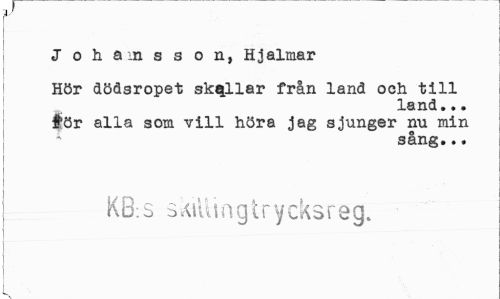 //// a - //// Johamsson, Hjalmar //// Hör dödsropet skqllar från land och till //// land... //// #ör alla som vill höra jag sjunger nu min //// sang... //// KB:s s^tlungtrycksreg. ////
