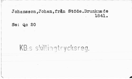 //// I //// Johansson,Johan,från Stöde.Drunknade //// 1841. //// i //// Se: <ic 20 //// ! KB s skiUinntrycksreg. //// ¦ //// N ////