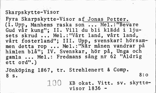 //// Skarpskytte-Visor //// Fyra Skarpskytte-Visor af Jonas Petter. (I. Upp, Manhems raska son ... Mel .7,YBevare Gud vår kung"; II. Vill du bli klädd i ljusets skrud ... Mel.:"Vårt land, vårt land, vårt fosterland"; III. Upp, svenskar! hörsammen detta rop ... Mel.:"När månen vandrar på himlen blå"; IV. Svenskar, hör på, Unga och gamla ... Mel.: Fredmans sång nr 62 "Aldrig ett ord".) //// Jönköping 1867, tr. Strehlenert & Comp. 8 s. 8:o //// 100 KB okat. Vitt. sv. skytte- //// visor 1836 - ////