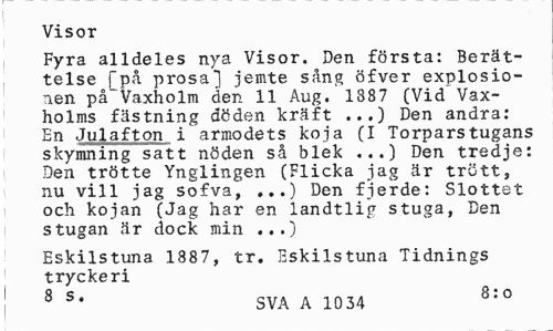 //// Visor //// Fyra alldeles nya Visor. Den första: Berättelse [på prosa] jemte sång öfver explosionen på Vaxholm den 11 Aug. 1387 (Vid Vaxholms fästning döden kräft Den andra: En Julafton i armodets koja (I Torparstugans skymning"satt nöden så blek ...) Den tredje: Den trötte Ynglingen (Flicka jag är trött, nu vill jag sofva, ...) Den fjerde: Slottet och kojan (Jag har en landtlig stuga, Den stugan är dock min ...) //// Eskilstuna 1887, tr. Eskilstuna Tidnings tryckeri //// ! 8 S* SVA A 10 34 8:0 ////