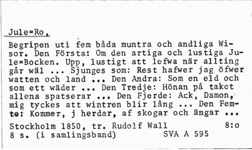 //// Jule=Ro, //// Begripen uti fem båda muntra och andliga Wi-sor. Den Första: Om den artiga och lustiga Ju-le=Bocken. Upp, lustigt att lefwa när allting går wäl ... Sjunges som: Rest hafwer jag öfwer watten och land ... Den Andra: Som en eld och som ett wäder ... Den Tredje: Hönan på taket allena spatserar ... Den Fjerde: Ack, Damon, mig tyckes att wintren blir lång ... Den Femte: Kommer, j herdar, af skogar och ängar //// Stockholm 1850, tr. Rudolf Wall 8:0 //// 8 s. (i samlingsband) SVA A 595 ////