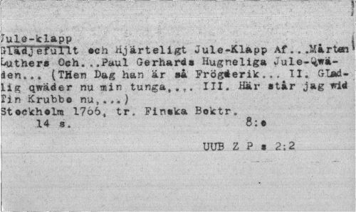 //// Fule-klapp j //// JUijefullt «ch Hjärteligt Jule-Klapp Af.. .Jlärtan1 ^uthera Och...Paul Gerhard» Hugneliga Jule-^wä-ien... (THen Dag han är så Frögéerik. . . II. Glad-Lig qwäder nu min tunga,.,. III. Här stir jag wid Din Krubbe nu,... ) 3teekhalm 17ö6« tr. Fin»ka Boktr. //// 14 s» 8 //// UUB Z P 9 2;2 ////