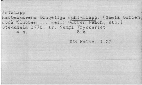 //// J ulklapp //// Hattmakarens Odugeliga ? uhl -r:.Iapp, (Gamla Gubben uopå Klubben, .. . mel,: Gubben ueach„ etc.} Steckholm 1770, tr, Kongl Tryckeriet 4s Se //// UUB Folk7, 1.27 ////