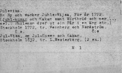 //// Tulevisa. //// Er Ny och vacker Juhle-Wijsa, För år 1772. (Juhl-kus^r och Kakan samt Wcrtbrod och mer,'... 8el .: Phiiemor dref ut sjn Får i en äng etc.) Stsckholm 1772, tr. Wennberg och Nord ström . //// £ s. 8:0 //// Jul-Wiaa, om Jul-Kusen och Kakan. Stockholm 1832, tr. L.Westerberg, (2 ex.) //// M 1 ////