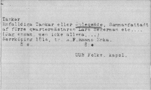 //// Tankar //// En fälld i ga Tankar eller J-;.!eciwäd e . Sammanfattartt af förre qvarterT.ästarfen^TaTr&lSTgerman etc . . (Jag ensam ' men icke a 11 era,,., i Ko rrk öp i ng 1814 , tr.. a,F„ Kaam E nka . 6 s 8. • //// UUE Fclkv. kapsl. ////