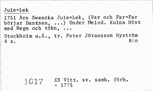 //// Jule=Lek //// 1751 Ars Swenska Jule=Lek, (Far och Far=Far börjar Dantsen, ...) Under Melod. Kulna Höst med Regn och tökn, ... //// Stockholm u.å., tr. Peter Jöransson Nyström 4 s. 8:0 //// 1D17 KB vitt' sv« samh. förh. - 17 75 ////
