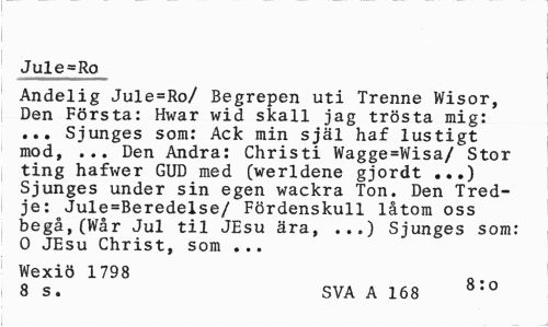 //// Jule=Ro //// Andelig Jule=Ro/ Begrepen uti Trenne Wisor, Den Första: Hwar wid skall jag trösta mig: ... Sjunges som: Ack min själ haf lustigt mod, ... Den Andra: Christi Wagge=Wisa/ Stor ting hafwer GUD med (werldene gjordt ...) Sjunges under sin egen wackra Ton. Den Tredje: Jule=Beredelse/ Fördenskull låtom oss begå,(Wår Jul til JEsu ära, ...) Sjunges som: 0 JEsu Christ, som ... //// Wexiö 1798 „ //// 8 s. SVA A 168 0,0 ////