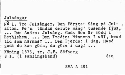 //// Julsånger //// N- 1. Tre Julsånger. Den Första: Sång på Jul- , afton. Re'n tändas derute mång' tusende ljus, ... Den Andra: Julsång. Guds Son är född i Bethlehem, ... Den Tredje: Minnens I wäl, hwad tid som näriftas? ... Den Fjerde: I dag. Hwad godt du kan göra, du göre i dag.' ... //// Köping 1875, tr. J.F. Säfberg 8 s. (i samlingsband) 8:o //// SVA A 491 ////