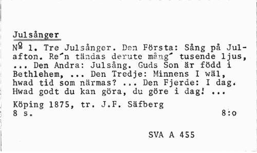 //// Julsånger //// rnmmmmmmmmmmmmmmmmmrn //// 1. Tre Julsånger. Den Första: Sång på Julafton. Re"*n tändas derute måxig" tusende ljus, ... Den Andra: Julsång. Guds Son är född i Bethlehem, ... Den Tredje: Minnens I wäl, hwad tid som närmas? ... Den Fjerde: I dag» Hwad godt du kan göra, du göre i dag.' ... //// Köping 1875, tr. J.F. Säfberg 8 s. 8: o //// SVA A 455 ////