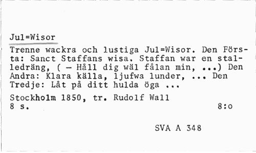 //// Jul=Wisor //// Trenne wackra och lustiga Jul=Wisor. Den Första: Sanct Staffans wisa. Staffan war en stalledräng, ( - Håll dig wäl fålan min, ...) Den Andra: Klara källa, ljufwa lunder, ... Den Tredje: Låt på ditt hulda öga ... //// Stockholm 1850, tr. Rudolf Wall 8 s. 8:0 //// SVA A 34 8 ////