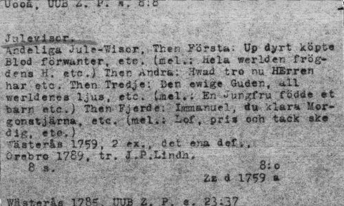 //// „ _„ f «. 1 . , ö , t) - - — J eviscr. //// fEdéUga Jule-Wiscr, Then Första; Up dyrt köpte jlod förwunter, etc. (r.el.; nela werlden frög-dens H, etc.) Tnen Andra; Hwad tro nu H£r.r**l har etc. Then Tredje: Den ewige Guden, *U werldenes ljus, etc. Uel.; En Jungfru födde et barn etc.) Then Fjerde: Immanuel, du klara Morgonstjärna, etc. (mel.; Lof, pri» och tack ske dig, «fce.) //// råsterås 1759, 2 ex., det ena def.. Örebro 1769, tr. J.P.Lindh. //// 8 8;o //// Zf-é 1759 a //// 'JÄ ___» ' ___ L ////