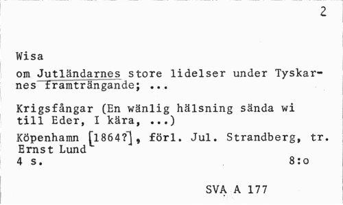 //// z //// Wisa //// om Jutländarnes store lidelser under Tyskarnes framträngande; ... //// Krigsfångar (En wänlig hälsning sända wi till Eder, I kära, ...) //// Köpenhamn [l864?^j, förl. Jul. Strandberg, tr. Ernst Lund //// 4 s. 8:0 //// SVA A 177 ////