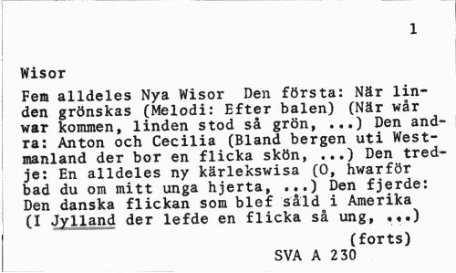 //// 1 //// Wisor //// Fem alldeles Nya Wisor Den första: När linden grönskas (Melodi: Efter balen) (När wår war kommen, linden stod så grön, ...) Den andra: Anton och Cecilia (Bland bergen uti West-manland der bor en flicka skön, ...) Den tredje: En alldeles ny kärlekswisa (0, hwarför bad du om mitt unga hjerta, ...) Den fjerde: Den danska flickan som blef såld i Amerika (I Jylland der lefde en flicka så ung, ,?«) //// (forts) SVA A 2 30 ////