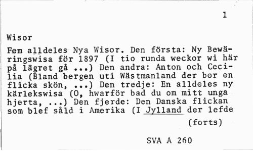 //// 1 //// Wisor //// Fem alldeles Nya Wisor. Den första: Ny Bewä-ringswisa för 1897 (I tio runda weckor wi här på lägret gå ...) Den andra: Anton och Cecilia (Bland bergen uti Wästmanland der bor en flicka skön, ...) Den tredje: En alldeles ny kärlekswisa (0, hi^arför bad du om mitt unga hjerta, ...) Den fjerde: Den Danska flickan som blef såld i Amerika (I Jylland der lefde //// (forts) SVA A 260 ////