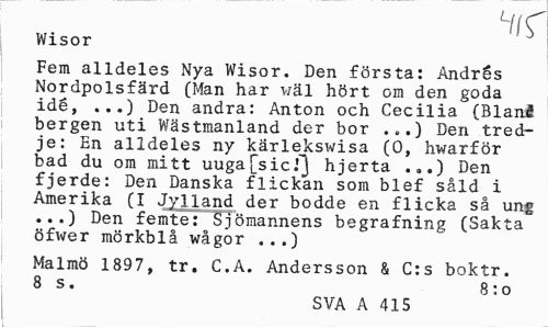 //// Wisor //// Fem alldeles Nya Wisor. Den första: Andrés Nordpolsfärd (Man har wäl hört om den goda idé, ...) Den andra: Anton och Cecilia (Blanå bergen uti Wästmanland der bor ...) Den tredje: En alldeles ny kärlekswisa (0, hwarför bad du om mitt uuga[sicJ] hjerta ...) Den fjerde: Den Danska flickan som blef såld i Amerika (I Jylland der bodde en flicka så ung ...) Den femte: Sjömannens begrafning (Sakta öfwer mörkblå wågor ...) //// Malmö 1897, tr. C.A. Andersson & C:s boktr. 8 s. 8 : o //// | SVA A 415 ////
