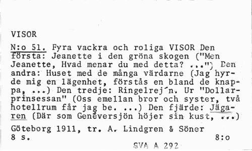 //// VISOR //// N:o 51. Fyra vackra och roliga VISOR Den första; Jeanette i den gröna skogen ("Men Jeanette, Hvad menar du med detta? .».") Den andra: Huset med de många värdarne (Jag hyrde mig en lägenhet, förstås en bland de knappa, .,.) Den tredje: Ringelrej"n. Ur "Dollar-prinsessan" (Oss emellan bror och syster, två hotellrum får jag be. ...) Den fjärde: Jägaren (Där som Genéversjön höjer sin kust, ...) //// Göteborg 1911, tr. A, Lindgren & Söner 8 s. 8:o //// SVA A 292 ////