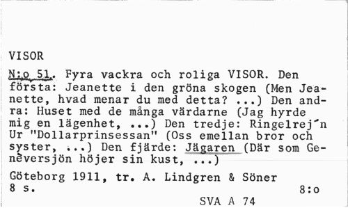 //// VISOR //// N5lr. Fyra vackra och roliga VISOR. Den första: Jeanette i den gröna skogen (Men Jeanette, hvad menar du med detta? ...) Den andra: Huset med de många värdarne (Jag hyrde mig en lägenhet, ...) Den tredje: Ringelrej^n Ur "Dollarprinsessan" (Oss emellan bror och syster, ...) Den fjärde: Jägaren (Där som Ge-néversjön höjer sin kust, ...) //// Göteborg 1911, tr. A. Lindgren & Söner 8 s. 8:o //// SVA A 74 ////