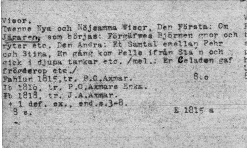 //// T««nne % a och $&Jmuma> tfiser, Der Första; Om Jite* rej^ son börjas: Förpfäfwes Björnen rrr.or och ryter etc. D«n Antfra: Ft Saratal emellan Pehr cf?h 3tir,a, Sr p&n^ korr Pelle ifrå^ Sta'n och <*ick i djupa tankar etc. /mel.; Er Celad#n amf fr&>d«ro£ etc./ //// Fahlun lölf, tr. P.C.Axnar. 8;o //// It iBlö, tr. P.C.AxBiare *fc I8l3, tr. J.A.Atsaar. //// + 1 def. ex., end.*,3»8, //// 3 e. £ 1815 a ////