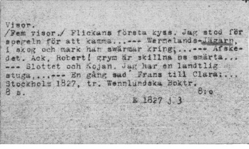//// Vitior. //// /Fem visor./ Flickan* första icyaa. Jap; stod för //// • pofeln för att kamma..W»ttié» //// i exog och mark har awärm&r krirg^.. Tra*ce-det. Ack, Kotert! gryn är skillna os smärta... //// • ••• Slottet och Kojan. Jag har en landtlig //// atugaSn gång aad' Frans till Clarft ;.., 3toekholx 1827, tr. Wennlundska Boktr, 8 B. Bi o //// K iö?7 j 3 //// . •• • ... ••. . _,• , •"' ' • • ... ••• ¦¦' " - ..V ¦¦¦¦, .. . .-•.- ;.: •'• . . - .-. . v*" ••'. ' ' • ¦ ¦ . , ////
