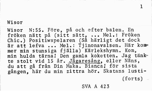 //// 1 //// Wisor //// Wisor N:55. Före, på och efter balen. En fröken nätt på (sitt sätt, ... Mel.: Fröken Chic.) Positiwspelaren (Så härligt det dock är att lefva ... Mel.: Tjinonavalsen. Här koia-mer min stunsiga fjälla) Kärlekshymn. Kom, min hulda tärna.' Den gamla koketten. Jag tänkte stolt vid 15 år. Jägaresång, eller Näns, du att gå från Din Maka. BiancaJ för sista gången, här du min zittra hör. Skatans lusti- //// (forts) //// SVA A 42 3 ////