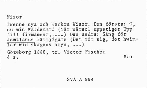 //// Wisor //// Twenne nya och V/ack ra Wisor. Den första: 0, du min Waldemar! (När wårsol uppstiger Upp till firmament,...) Den andra: Sång för Jemtlands Fältjägare (Det rör sig, det hv/im-Här wid skogens bryn, ...) //// Göteborg 1880, tr. Victor Fischer 4 s. 8: o //// SVA A 994 ////