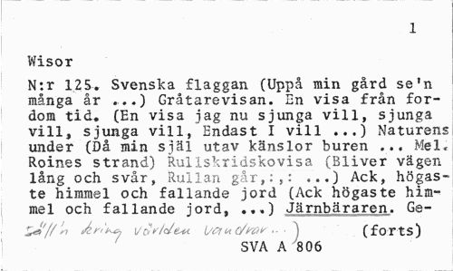 //// 1 //// Wisor //// N:r 125. Svenska flaggan (Uppå min gård se'n många år ...) Gråtarevisan. En visa från fordom tid. (En visa jag nu sjunga vill, sjunga vill, sjunga vill, Endast I vill ...) Naturens under (Då min själ utav känslor buren ... Mel, Roines strand) Rullskridskovisa (Bliver vägen lång och svår, Rullan går,:,: ...) Ack, högaste himmel och fallande jord (Ack högaste himmel och fallande jord, ...) Järnbäraren. Ge- //// Z*'//'i \jch'/c/<ut 1'ciucJ^y ¦¦ ¦ ^ (forts) //// SVA A 806 ////