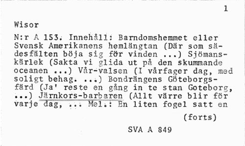 //// 1 //// Wisor //// N:r A 153. Innehåll: Barndomshemmet eller Svensk Amerikanens hemlängtan (Där som sädesfälten böja sig för vinden ...) Sjömanskärlek (Sakta vi glida ut på den skummande oceanen ...) Vår-valsen (I vårfager dag, med soligt behag. ...) Bondrängens Göteborgsfärd (Ja1 reste en gång in te stan Goteborg, ...) Järnkors-barbaren (Allt värre blir för varje dag, ... Mel.: En liten fogel satt en //// (forts) //// SVA A 849 ////