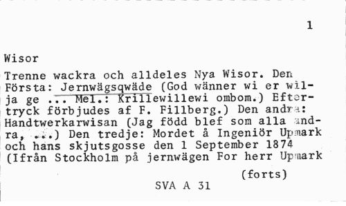 //// 1 //// Wisor //// Trenne wackra och alldeles Nya Wisor. Den Första: Jernwägsqwäde (God wänner wi er wil-ja ge ...Mel.: Krillewillewi ombom.) Eftertryck förbjudes af F. Fillberg.) Den andra: Handtwerkaritfisan (Jag född blef som alla indra, ...) Den tredje: Mordet å Ingeniör Upmark och hans skjutsgosse den 1 September 1874 (Ifrån Stockholm på jernwägen For herr Upiiark //// (forts) //// SVA A 31 ////