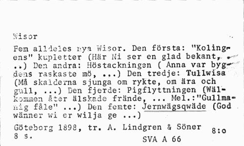 //// Wisor //// Fem alldeles i:-ya Wisor. Den första: "Koling" ens" kupletter (Hör Ni ser en glad bekant, .,) Den andra: Hös täckningen C Anna var byg-^ denä raskaste mö, ...) Den tredje: Tullwisa (Må skalderna sjunga om rykte, om ära och gull, ...) Den fjerde: Pigflyttningen (Wäl-kommen åter älskade frände, ... Mel.:"Gullma-iuig fale" • • Den femte: Jernwägsqwäde (God wänner wi er wilja ge ...) //// Göteborg 1898, tr. A. Lindgren S Söner g //// 8 s" SVA A 66 ////