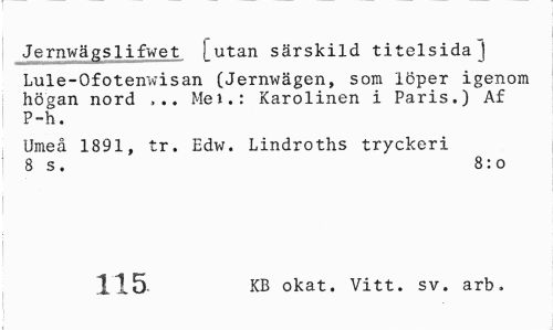 //// Jernwägslifwet [utan särskild titelsida | //// Lule-Ofotenwisan (Jernwägen, som löper igenom högan nord ... Mel.: Karolinen i Paris.) Af P-h. //// Umeå 1891, tr. Edw. Lindroths tryckeri 8 s. 8:0 //// 115 //// X i-U KB okat. Vitt. sv. arb. ////