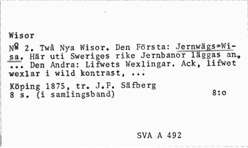 //// Wisor //// n2 2. Twå Nya Wisor. Den Första: Jernwäjgs=Wi-sa. Här uti Sweriges rike Jernbanor läggas an, ... Den Andra: Lifwets Wexlingar. Ack, lifwet wexlar i wild kontrast, ... //// Köping 1875, tr. J.F. Säfberg 8 s. (i samlingsband) 8:o //// SVA A 492 ////