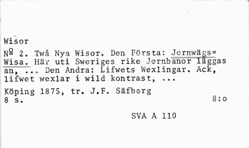 //// Wisor //// N- 2. Twå Nya Wisor. Den Första: Jernwägs= Wisa. Här uti Sweriges rike Jernbanor läggas an, ... Den Andra: Lifwets Wexlingar. Ack, lifwet wexlar i wild kontrast, ... //// Köping 1875, tr. J.F. Säfberg 8 s. 8:o //// SVA A 110 ////