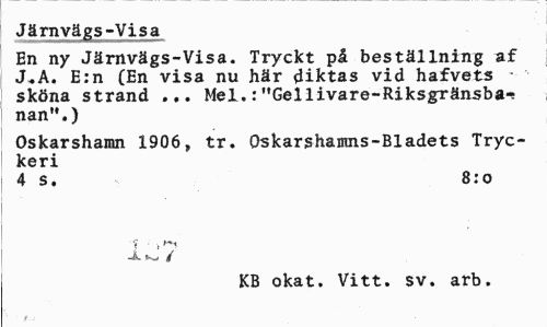 //// Järnvägs-Visa //// En ny Järnvägs-Visa. Tryckt på beställning af J„A. E:n (En visa nu här diktas vid hafvets -sköna strand ... Mel.:"Gellivare-Riksgränsba^ nan".) //// Oskarshamn 1906, tr. Oskarshamns-Bladets Tryckeri //// 4 s. 8:0 //// JlkJ / //// > 1 KB okat. Vitt. sv. arb. ////