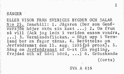//// 1 //// SÅNGER //// ELLER VISOR FRÄN SVERIGES BYGDER OCH DALAR N:o 25. Innehåll: 1. Jägaren (Der som Gené-versjön höjer skön sin kust ...) 2. Om frun så vill (Ack jag leds i verlden ensam vandra, ...) 3. Vermlandsflickan. - Högt upp i Verm-land bor en fager tärna. 4» Berättelse om Jerfsödramat den 11. aug, 1895 (jpå prosa^. 5. Sång om Jerfsödramat af G-st (En yngling, frejdad och af ädel börd, .,.) 6. Grönskande //// (forts) //// SVA A 416 ////