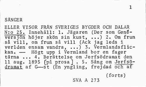 //// 1 //// SÅNGER //// ELLER VISOR FRÄN SVERIGES BYGDER OCH DALAR N:o 25. Innehåll: 1. Jägaren (Der som Gené-versjön höjer skön sin kust, ...) 2. Om frun så vill, om frun så vill (Ack jag leds i verlden ensam vandra, ...) 3. Värmlandsflickan. — Högt upp i Vermland bor en fager tärna ... 4. Berättelse om Jerfsödramat den 11 aug. 1895 Q>å prosa] . 5. Sång om Jerfsö-dramat af G—s~t (En yngling, frejdad och af //// (forts) //// SVA A 2 73 ////