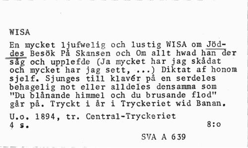 //// WISA //// En mycket ljufwelig och lustig WISA om Jöd-des^ Besök På Skansen och Om allt hwad han der säg och upplefde (Ja mycket har jag skådat och mycket har jag sett, ...) Diktat af honom sjelf. Sjunges till klavér på en serdeles behagelig not eller alldeles densamma som "Du blånande himmel och du brusande flod" går på. Tryckt i år i Tryckeriet wid Banan. //// U.o. 1894, tr. Central-Tryckeriet 4 s. 8:0 //// SVA A 6 39 ////