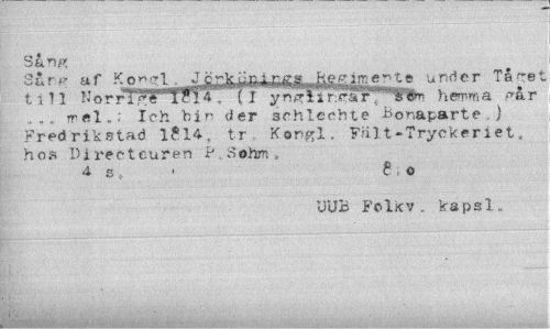 //// Sårig //// Sur»? af K o g 'T1 . Jgj^ili: j, ftHb^tfijg irc« n t e under Tå re: //// till K o r rTPT'' TST* 7" (I ynki.1 r^af,...h emm a ?»å r //// rrftl.: Ich bin der schlcebte i>or.aparte .) Fredrikstad 1514;. tr Kon&l. Fält-Tryckeriet, hos I)irecteuren P Sohm //// 4 Sä. • 80 //// UUB Folkv. kapsl» ////