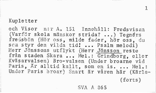 //// 1 //// Kupletter //// och Visor n:r A. 151 Innehåll: Fredsvisan (Varför skola mänsKor strida? . ..) Tegnérs fredsbön (Hör oss, milde fader, hör oss, du som styr den vilda tid! ... Psalm melodi) Herr Jönssons utflykt (Herr Jönsson reste från staden Skara ... Mel.: Grindborg, eller Kväsarvalsen) Bro-valsen (Under broarne vid Paris, Är alltid kallt, som en is. ... Mel.: Under Paris broar) Snart är våren här (Kärle- //// (forts) //// SVA A 86 5 ////
